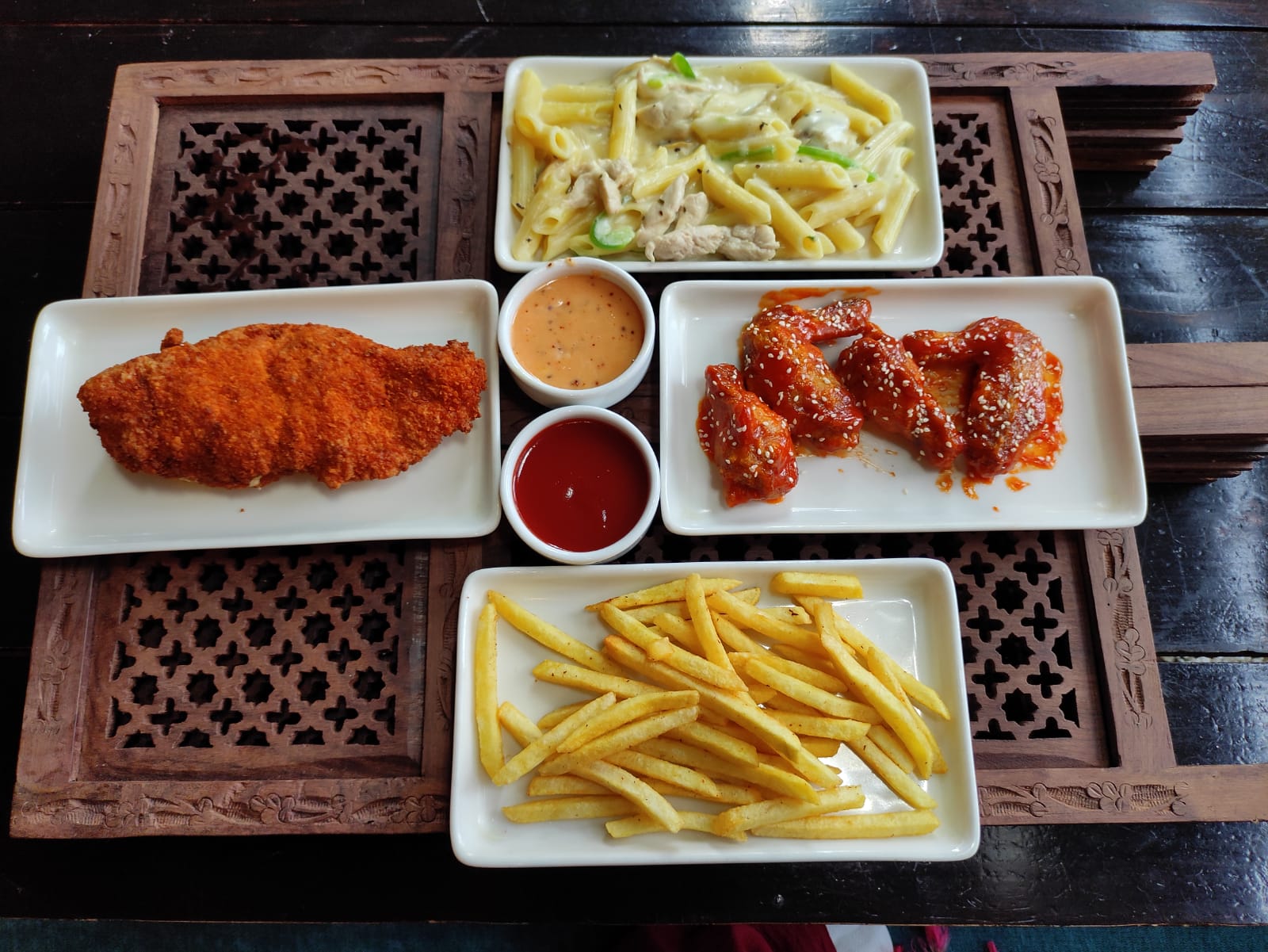4. Creamy/Spicy Chicken Pasta (1Pax), Cheese Lava Chicken Breast (1Pcs) Buffallo Chicken Wings (4 Pcs) & French Fry