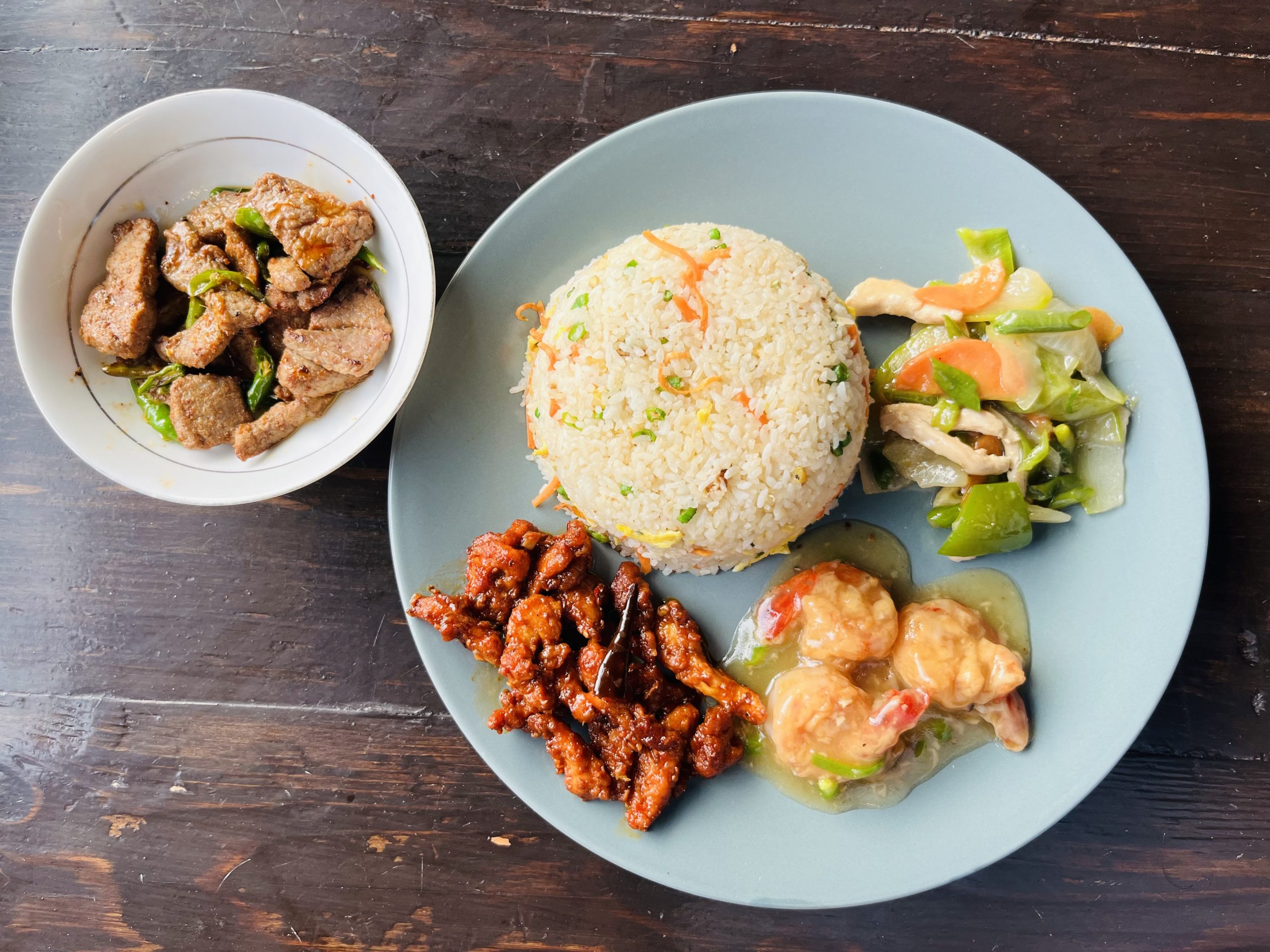 Fried Rice with Garlic Prawn, Szechuan Chicken, Beef Chili Dry & vegetables